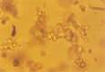 Рис. 7. Микрофотография аморфных кристаллов ксантина в мочевом осадке 7,5-летнего кастрированного кота, получавшего орально аллопуринол для расстворения камней аммония урата в мочевом пузыре (неокрашено, увеличение Х 25).