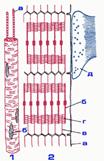 Каждая мышца состоит из параллельных пучков поперечно-полосатых мышечных волокон. Каждый пучок одет оболочкой. И вся мышца снаружи покрыта тонкой соединительнотканной оболочкой, защищающей нежную мышечную ткань. Каждое мышечное волокно также имеет снаружи тонкую оболочку, а внутри него находятся многочисленные тонкие сократительные нити - миофибриллы и большое количество ядер. Миофибриллы, в свою очередь, состоят из тончайших нитей двух типов - толстых (белковые молекулы миозина) и тонких (белок актина). Так как они образованы различными видами белка, под микроскопом видны чередующиеся темные и светлые полосы. Отсюда и название скелетной мышечной ткани - поперечно-полосатая. У человека скелетные мышцы состоят из волокон двух типов - красных и белых. Они различаются составом и количеством миофибрилл, а главное - особенностями сокращения. Так называемые белые мышечные волокна сокращаются быстро, но быстро и устают; красные волокна сокращаются медленнее, но могут оставаться в сокращенном состоянии долго. В зависимости от функции мышц в них преобладают те или иные типы волокон. Мышцы выполняют большую работу, поэтому они богаты кровеносными сосудами, по которым кровь снабжает их кислородом, питательными веществами, выносит продукты обмена веществ. Мышцы крепятся к костям с помощью нерастяжимых сухожилий, которые срастаются с надкостницей. Обычно мышцы одним концом крепятся выше, а другим ниже сустава. При таком креплении сокращение мышц приводит в движение кости в суставах.