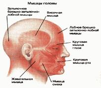 Мышцы головы составляют три группы мышц: жевательные, мимические и произвольные мышцы внутренних органов головы (мягкого неба, языка, глаз, среднего уха). Жевательные мышцы приводят в движение нижнюю челюсть. Мимические мышцы прикрепляются одним концом к коже, другим - к кости (лобная, щечная, скуловая и др.) или только к коже (круговая мышца рта). Сокращаясь, они изменяют выражение лица, учавствуют в замыкании и расширении отверстий лица (глазниц, рта, ноздрей), обеспечивают подвижность щек, губ, ноздрей.