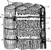 1—саркоплазматичний ретикулум;2—термінальні цистерни саркоплазматичного ретикулуму; 3 — Т-трубки; 4 — тріади; 5 —сарколема; 6 —міофібрили; 7—А-диск; 8— І-диск; 9 — Z-лінія; 10 — мітохондрії.