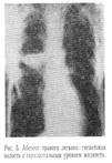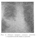 Прорыв абсцесса в бронх сопровождается выделением большого количества мокроты, за один-два дня до этого может появиться неприятный запах изо рта, иногда возможно небольшое количество слизистогнойной мокроты и кровохарканье. Количество мокроты составляет 250—400 мл, иногда достигает 1 л в сутки. В мокроте содержится много лейкоцитов, детрит, кристаллы жирных кислот, пробки Диттриха, эластические волокна и разнообразная микрофлора. Чаще всего мокрота желто-зеленого цвета и при отстое дает характерную слоистость: пенистый слой, гнойный и слизисто-серозный. Рентгенологически определяется изолированная одиночная полость, заполненная жидкостью и газом, с небольшой инфильтрацией вокруг. Полость может быть больших размеров (рис. 4, 5, 6).