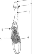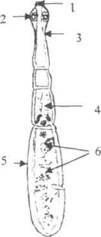 - хоботок с крючьями; 2 - присоски; 3 - шейка; 4 - гермафродитная проглот-тида; 5 - зрелая проглот-тила: 6 - матка с яйпами.