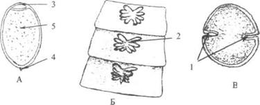 Рис. 3. Яйцо (А), зрелая проглоттида (Б) и поперечный срез сколекса (В) лентеца широкого (Dipbyllobothrium