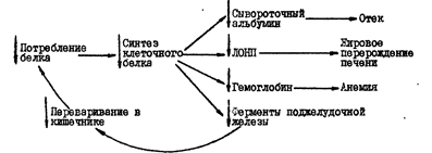 Белковый обмен обеспечивает непрерывность воспроизводства и обновления белков организма. Показано, что в среднем каждые 3 недели половина белковых компонентов человеческого тела полностью обновляется путем распада и ресинтеза. При этом общая скорость синтеза белков в организме в состоянии азотистого равновесия достигает 500 г в день, т.е. почти в. 5 раз превосходит среднее потребление с пищей. Естественно, что такой результат, может быть обеспечен только за счет повторного использования аминокислотных предшественников и продуктов распада белков. Белки органов и тканей нуждаются в постоянном обновлении. В конечном счете, животным необходим не белок как таковой, а определенные аминокислоты, освобождающиеся при его гидролизе. Известно, что у детей продолжительный недостаток гистидина приводит к нарушению образования гемоглобина к возникновению экземы. Дефицит основной аминокислоты аргинина не сказывается на нормальном росте, но может привести к нарушению сперматогенеза.