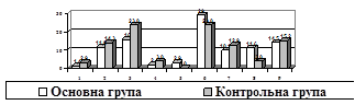 5. Перебіг першого триместру вагітності після допоміжних репродуктивних технологій у 66,7% жінок із тиреоїдною патологією супроводжувався розвитком ускладнень, що перевищувало відповідний показник в контрольній групі (28,6%, р<0,05). Зокрема, спостерігались: загроза переривання у 40,0%, мимовільний аборт у 13,3% та мимовільна редукція одного плоду із двійні у 13,3% (17,1%; 5,7%; 5,7% - відповідно в контрольній групі, р>0,05).