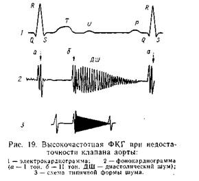 На ФКГ регистрируется ослабление I тона над верхушкой, может быть выражен III тон, во II межреберье справа — ослабление II тона. Непосредственно за II тоном следует характерный для порока убывающий по интенсивности диастолический шум (рис. 19). Иногда на ФКГ шума нет, но он четко выслушивается. Аортальный диастолический шум высокочастотный, в связи с чем иногда необходимо значительное усиление прибора для его записи. Во II межреберье справа от грудины (иногда в точке Боткина и над верхушкой) может регистрироваться «сопровождающий» убывающий систолический шум.
