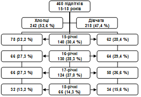 На основі аналізу 1292 карт розвитку (форма №12) для подальшого обстеження і лікування було відібрано 460 осіб віком 15-18 років, яким був встановлений діагноз ВД.15-річними вважали осіб віком від 14,5 до 15,5 років, 16-річними – від 15,5 до 16,5 років, 17-річними – від 16,5 до 17,5 років, 18-річними – від 17,5 до 18,5 років. Групу порівняння склали 130 практично здорових осіб відповідного віку.