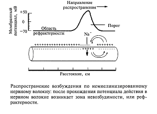 зона невозбудимости. Нам уже известно, что деполяризация приводит к открыванию потенциалзависимых натриевых каналов и в соседнем участке мембраны развивается потенциал действия. Затем натриевый канал инактивируется и закрывается, что и приводит к зоне невозбудимости волокна. Эта последовательность событий повторяется для каждого соседнего участка волокна. На каждое такое возбуждение тратится определенное время. Специальные исследования показали, что скорость проведения возбуждения немиелинизированных волокон пропорциональна их диаметру: чем больше диаметр, тем выше скорость движения импульсов.