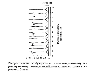 Благодаря такому устройству мембрана волокна возбуждается только в местах перехватов Ранвье. Вследствие этого потенциал действия (возбуждение) как бы перескакивает через участки изолированной мембраны. Другими словами, возбуждение движется скачками от перехвата к перехвату.