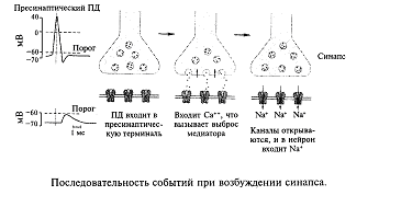 Вспомним, что нервный импульс (возбуждение) с огромной скоростью продвигается по волокну и подходит к синапсу. Этот потенциал действия вызывает деполяризацию мембраны синапса (рис. 11), однако это не приводит к генерации нового возбуждения (потенциала действия), а вызывает открывание специальных ионных каналов, с которыми мы еще не знакомы. Эти каналы пропускают ионы кальция внутрь синапса. Ионы кальция играют очень большую роль в деятельности организма. Специальная железа внутренней секреции - паращитовидная (она находится поверх щитовидной железы) регулирует содержание кальция в организме. Многие заболевания связаны с нарушением обмена кальция в организме. Например, его недостаток приводит к рахиту у маленьких детей.