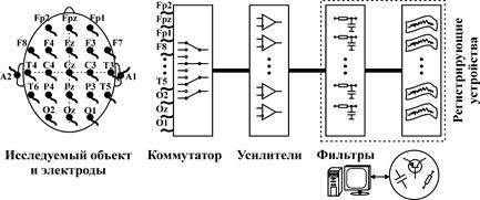 Типичная блок-схема энцефалографа представлена на рис. 14. Ниже мы более подробно обсудим назначение и особенности различных его элементов и узлов. Электроэнцефалографическая установка состоит из электродов, соединительных проводов, электродной распределительной коробки с пронумерованными гнездами, коммутационного устройства и некоторого количества каналов регистрации, позволяющих определенное количество независимых друг от друга процессов. При этом необходимо иметь в виду, что 4-канальные электроэнцефалографы непригодны для диагностических целей, так как позволяют выявить только грубые изменения, генерализованные по всей конвекситальной