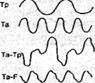 Схема регистрации ЭЭГ при монополярном отведении (1) с референтным электродом (R) а мочке уха и биполярных отведениях (2): O - затылочное отведение; P -теменное отведение; C - центральное отведение; F - лобное отведение; Ta - переднее височное отведение, Tp - заднее височное отведение; d - правое полушарие; s - левое полушарие; (1): К - напряжение под референтным ушным электродом; 0 - напряжение под активным электродом, К-0 — запись, получаемая при монополярном отведении от правой затылочной области; (2): Тр — напряжение под электродом в области патологического очага; Та - напряжение под электродом, стоящим над нормальной мозговой тканью; Та-Тр, Тр-0 и Та-Р - запись, получаемая при биполярном отведении от соответствующих пар электродов.