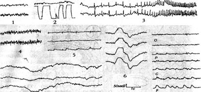 Основные типы артефактов на ЭЭГ: 1 — сетевая наводка; 2 — движение электрода на втором канала; 3 — от фотостимулятора; 4 — ЭМГ; 5— ЭКГ (верхний канал) и РГ (нижний канал); 6 — глотательное движение; 7— КГР; 8 — ЭОГ, наиболее выраженный в лобных отведениях.