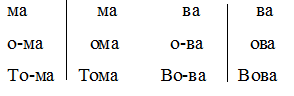Затем переходят к работе над ритмом, слиянием звуков в слог, читают слова: