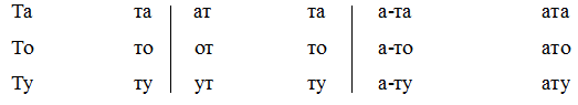 Проводится отработка готовых прямых и обратных слогов со звуком-буквой т, а также сочетаний "гласный + согласный + гласный":