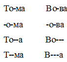Далее дети переходят к упражнениям в чтении слогов и буквенных сочетаний, при этом материал дается соответственно составу слова Тома, а также сочетаний, прорабатывавшихся ранее: