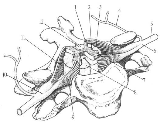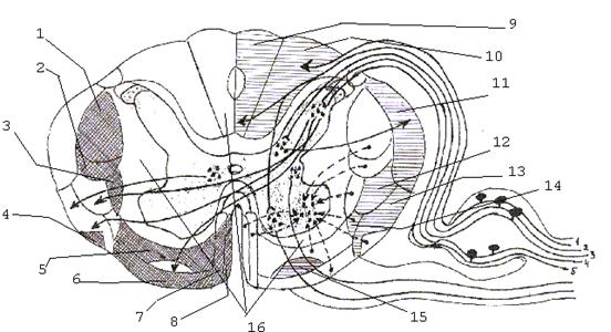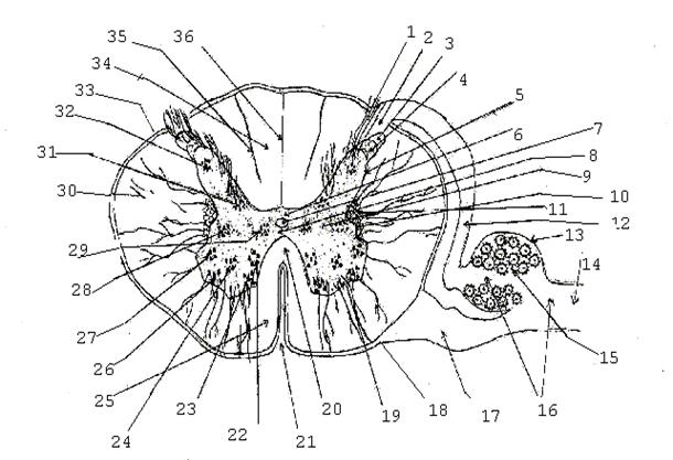 columna posterior; 2- columna lateralis; 3- funiculus lateralis; 4- r.dorsalis; 5- r.ventralis; 6- n.spinalis; 7- columna anterior; 8- funiculus anterior; 9- radix ventralis; ganglion spinale; 11- radix dorsalis; 12- funiculus posterior.