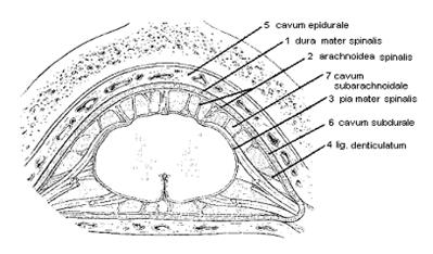 рис.5. Оболочки и межоболочечные пространства спинного мозга.