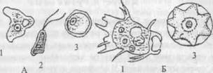 Рис. 2. Амебы группы Umax. А - Naegleria, Б - Acanthamoeba: 1 - амебоидная стадия, 2 - жгутиковая стадия, 3 - циста.
