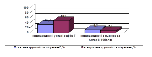 Отримані дані були підтверджені нами після пологів за результатами стану новонароджених. Дані оцінки новонароджених за шкалою Апгар у групі жінок, що отримували нашу схему лікування, підтверджують його ефективність у профілактиці ПН. Новонароджені в даній групі достовірно частіше (р < 0,01) народжувались з оцінкою за Апгар 8-10 балів (11,3% проти 7,1%) і достовірно менше (р < 0,05) у стані асфіксії – 32,7% проти 48,9% відповідно (рис. 1).