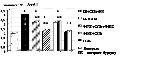 На фоні попереднього введення екстракту буркуну і ФіБСу активність АлАТ збільшується лише на 62 %, а АсАТ на 74 і 86 %, відповідно (при контрольній патології АлАТ на 112,8 %, АсАТ на 131,9 %) . Профілактично-лікувальне введення вірогідно знижувало цитоліз гепатоцитів. При застосувані екстракту буркуну показники відновилися до рівня інтактних тварин. У групі, що отримувала ФіБС зберігалось достовірне підвищення активності ферментів цитолізу АлАТ і АсАТ на 30 % відповідно (рис. 1).