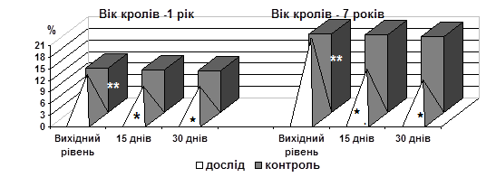 Виявлено, що вміст водорозчинних антиоксидантів в крові старих кролів до початку експерименту був в значній мірі знижений при порівнянні з молодими (12,4 ± 1,0 мекв/л крові проти 19,3 ± 1,0 мекв/л крові) і становив 64 %. Вміст жиророзчинних антиоксидантів в крові старих тварин відносно молодих склав79,2 % (8,0 ± 0,6 мкекв/л крові проти 10,1 ± 0,8 мкекв/л крові). Активність каталази в плазмі крові 7-річних кролів (315,2 ± 21,2 мккат/л) при порівнянні з 1- річними (502,4 ± 34,1 мккат/л) складала 62 % (р<0,05).