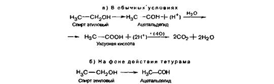 Механизм действия тетурама заключается в том, что он задерживает окисление спирта этилового на уровне ацетальдегида (по-видимому, он угнетает альдегиддегидрогеназу). Накопление последнего в организме вызывает интоксикацию, которая сопровождается весьма тягостными ощущениями. Возникают чувство страха, боли в области сердца, головная боль, гипотензия, обильное потоотделение, тошнота, рвота. Ниже представлен механизм действия тетурама.