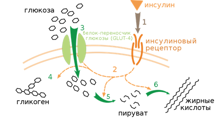 Эффект инсулина в захвате и метаболизме глюкозы. Связывание рецептора с инсулином(1) запускает активацию большого количества белков (2). Например перенос Glut-4-переносчика на плазматическую мембрану и поступление глюкозы внутрь клетки(3), синтез гликогена(4), гликолиз (5), синтез жирных кислот (6).