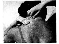 Масаж спини починають з поглажування верхнього краю трапецієподібних м'язів, що проводять у напрямку від потилиці до плечового суглоба і надключичних лімфатичних вузлів. Поглажування виконують або одною протилежною рукою, або одночасно двома руками. Потім проводять щипцеподібне розтирання верхніх країв трапецієподібних м'язів (мал. 4): рука з боку масажованого м'яза захоплює її верхній край так, щоб великий палець знаходився над ключицею, протилежну руку заносять за шиї - великий палець розташовують на задній поверхні м'яза.