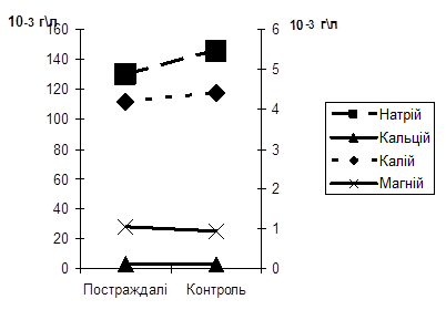 г/л (kS=2,38, р<0,05), одночасно відмічається статистично незначне збільшення кількості кальцію і магнію до (2,84±0,15)·10-3