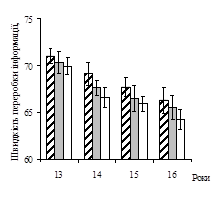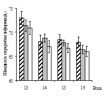 – окреслено контингент обстеження й обґрунтовано методи його дослідження. Об’єктом дослідження було учні Черкаської загальноосвітньої школи №11 (віком від 13 до 16 років). Загальна кількість респондентів становить 405 осіб обох статей. Вибірка була репрезентативна відповідно до критеріїв, що були розроблені в ході дослідження. Лонгітюдні обстеження проведено на 142 учнях – (69 хлопців та 73 дівчини). Такий підхід уможливив вивчення динаміки психофізіологічних функцій на одних і тих же учнях (тривалість дослідження - чотири роки). Для зіставлення результатів обстеження було проведено зрізові дослідження (охоплено 263 особи – респонденти). Властивості нейродинамічних функцій та сенсомоторну реактивність вивчено згідно з методикою М. Макаренка (технічний супровід – комп’ютерний комплекс „Діагност-1”). Функціональну рухливість нервових процесів