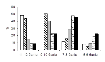 Рис. 1 Розподіл (%) учнів за балом успішності навчання між групами з - високим, - вище середнього, - середнім, - нижче середнього, - низьким рівнем психофізіологічного та фізичного розвитку