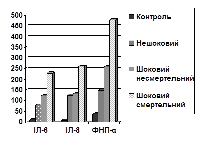 Концентрація цитокінів в сироватці крові зростала, зберігаючи тенденцію зростання від не шокового (мінімальна) до шокового смертельного (максимальна) типу посттравматичної реакції. Концентрація ІЛ-6 збільшувалася в 7,9 разів при нешоковому типі, в 12,3 разів - при нешоковому смертельному і в 22,9 разів - при шоковому типі посттравматичної реакції. Концентрація ІЛ-8 змінювалася сильніше: у 16.0, 17,0 і 20,9 разів відповідно згаданих типів посттравматичної реакції. Ступінь зміни ФНП-б була, в порівнянні з іншими цитокіни, меншою. Так при нешоковому типі концентрація ФНП-б була в 3,9 рази, при шоковому несмертельному – в 6,8 раз, а при шоковому смертельному – в 12,5 раз більшою, ніж в контролі.