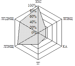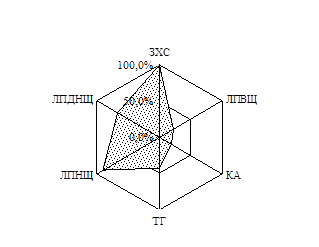 Як відомо, дисліпідемії майже завжди супроводжують ЦД, посилюючись за наявності надлишкової ваги. За результатами вивчення особливостей ліпідного обміну хворих на ЦД 2 типу, залежно від ступеня інсулінової недостатності, було побудовано факторні моделі, які виявили наявність в обох групах хворих дисліпідемій ІІ-а та ІV типу (ВООЗ). У ІІ групі також виділено присутність гіпоальфахолестеринемії, яка є самостійним чинником ризику атеросклерозу (Клімов А.М. і співавт., 1999). Для візуальної оцінки показників ліпідного спектру було побудовано діаграми частот виявлення відхилень показників ліпідного спектру від нормативних значень (Рис. 1).