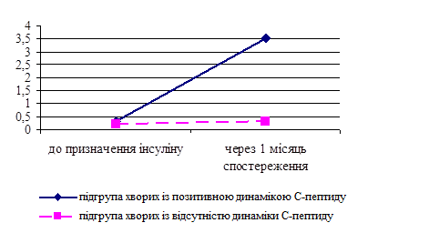 **- достовірність різниці між показниками в підгрупах хворих з позитивною динамікою та відсутністю динаміки С-пептиду через 1 місяць спостереження (р<0,001)