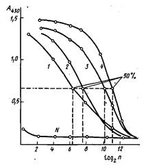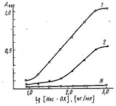 Результаты в этом случае обычно оценивают с помощью понятия "50% -ный титр". На рис. приведены кривые титрования антисывороток к инсулину, полученных иммунизацией морских свинок. Максимальный сигнал, регистрируемый по оптической плотности А
