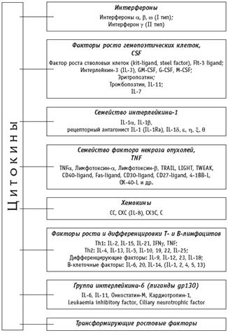Все цитокины, а их в настоящее время известно более 30, по структурным особенностям и биологическому действию делятся на несколько самостоятельных групп. Группировка цитокинов по механизму действия позволяет разделить цитокины на следующие группы: