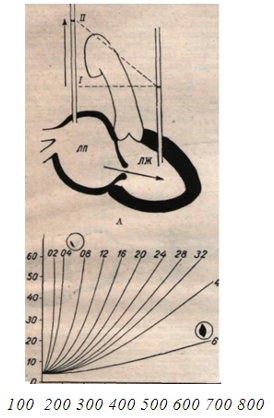 Рис. 1. Градиенты давления: А—схема градиентов между левым предсердием (ЛТ1) и левым желудочком (ЛЖ) в норме (I) и при митральном стенозе; В —кривые градиентов давления между левым предсердием и левым желудочком при сушении митрального отверстия: по вертикали — градиент давления (в мм рт. ст.); по горизонтали — скорость кровотока (в см3/сек диастолы); цифры по концам кривых—площадь митрального отверстия (в см).