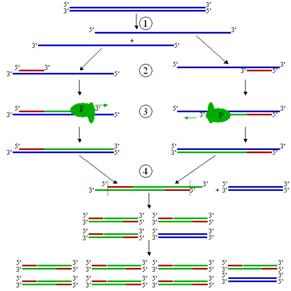 Рис. 1. Схематическое изображение первого цикла ПЦР. (1) Денатурация. (2) Отжиг. (3) Элонгация. (4) Закончен первый цикл.