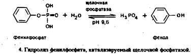 Ферментные метки. В электрохимическом иммуноанализе в качестве метки хорошо зарекомендовала себя щелочная фосфатаза. На рис.4 представлено уравнение реакции гидролиза фенилфосфата, который чаще всего применяют в качестве субстрата этого фермента. Образующийся фенол можно окислить в карбонатном буфере при + 750 мВ относительно хлорсеребряного электрода, в то время как субстрат фенил фосфат при положительном потенциале электрохимически неактивен. Образование способного окисляться продукта устраняет необходимость удаления кислорода из пробы перед анализом, как это принято в восстановительных электрохимических экспериментах. Конечно, и ранее щелочная фосфатаза использовалась в иммуноанализе, но только в сочетании со спектрофотометрическим определением продуктов.