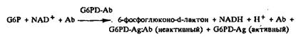 Вполне успешно использовавшийся для определения гаптенов гомогенный иммуноферментный анализ значительно реже применяли для определения антител. Недавно описаны такие методики для определения антител к лекарственным препаратам. Цель разработки заключалась в упрощении существующих методик определения антител при сохранении требуемой чувствительности. Метод основан на ингибировании ферментативной активности конъюгата антиген-фермент определяемыми антителами, а в качестве фермента применяли глюкозо-6-фосфатдегидрогеназу: