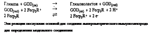 , оживило интерес к применению этой метки в гомогенном иммуноанализе. Показано, что при восстановлении флавина глюкозооксидазой в присутствии глюкозы окисленную форму фермента можно регенерировать путем переноса электронов на феррициний-ион, образующийся на электроде. Такая система не зависит от присутствия кислорода, так как феррициний-ион становится как бы вторым кофактором глюкозооксидазы: лидокаина.