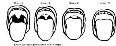 Современная практика показывает необходимость оценки ротоглотки и подбородочной области. Ротоглотку исследуют в положении больного сидя с разогнутой шеей, при высунутом языке и в момент фонации. Выделяют четыре класса ротоглотки, впервые описанные Mallampati, сгруппированные соответственно визуализируемым структурам.