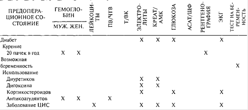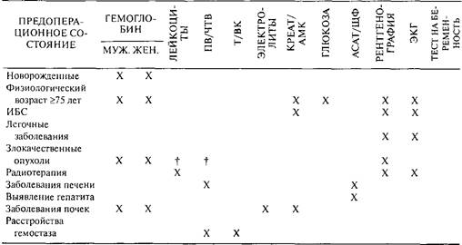 * При минимально инвазивных операциях (катаракты, диагностическая артроскопия) исследования не показаны. При умеренно инвазивных вмешательствах (операции, при которых кровопотеря или гемодинамические колебания редки) следует руководствоваться клинической целесообразностью объема обследования. X - выполнение; f- выполнение только для лейкемии; ПВ - протромбиновое время; ЧТВ - частичное тромбопластиновое время; Т - тромбоциты; ВК - время кровотечения; креат/АМК - креатинин или азот мочевины крови; АсАТ - аспартатаминотрансфераза; ЩФ - щелочная фосфатаза; ЭКГ - электрокардиография; ЦНС- центральная нервная система.
