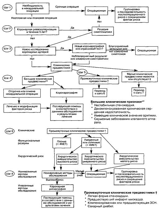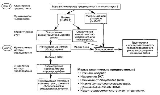 Нижеследующий алгоритм разработан группой специалистов, включенных в исследование периоперативной сердечной функции. Клинические признаки (или "предвестники") повышенного периоперационного кардиального риска, оценка функциональных резервов больного и риск, обусловленный спецификой операции, в совокупности позволяют определить, возможно ли оперативное вмешательство у больного, либо требуется проведение дальнейшего обследования и лечения. (Больные, которые не могут удовлетворить потребности четырех метаболических эквивалентов (4МЕТ), относятся к группе высокого риска. Подъем на пролет лестницы определяется как 4МЕТ-активность) Алгоритм воспроизведен ниже, но читатели могут обратиться к библиографическим ссылкам для лучшего понимания этих сложных и важных концепций.