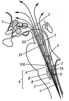 1 — ядра гипоталамуса; 2 — сон, бодрствование, сознание; 3 — зрительная пространственная ориентация, высшая вегетативная координация процесса поглощения пищи (жевание облизывание, сосание и др.); 4 — ядер ный центр регуляции дыхания, вегетативной координации дыхания и кровообращения, акустическо-вестибулярная пространственная ориентация 5 — вегетативное ядро блуждаюшего нерва; 6 — область вегетативной координации артериального давления сердечной деятельности, сосудистого тонуса, вдоха и выдоха, глотания тошноты и рвоты: А — глотание; Б - вазомоторный контроль; В — выдох Г — вдох; 7 — триггерная зона рвоты: III, IV, VII, IX, X - черепные нервы