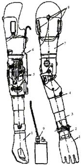 гильзы плеча 7, системы биоэлектрического управления 8 и блока питания 9.