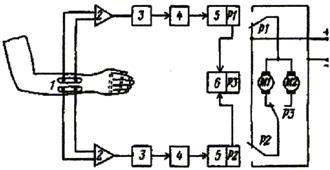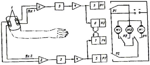 Работа системы управления может быть описана с помощью блок-схемы. Сигнал с управляющей мышцы, например бицепса, через электроды отведения биопотенциалов 1
