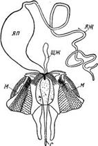 Рисунок 1. Жало рабочей пчелы: ЩЖ—щелочная железа; ЯП—ядовитый пузырь; ЯЖ—ядовитая железа; М— мышцы; С—стилеты.