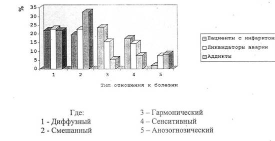 Среди так называемых "чистых" типов отношения к болезни в выборке преобладают типы хотя и с меньшей выраженностью степени дезадаптации, но с нарушением функций социального функционирования. Стоит отметить, что сенситивный тип реагирования был выделен лишь у 8% наркотически зависимых пациентов, что на порядок ниже, чем в других когортах пациентов. Этот показатель подтверждает наше предположение о том, что саморазрушительное поведение в аддикции проявляется в первую очередь через отказ от взаимодействия с данным миром. Поэтому чаще всего аддик-тивную личность не интересует, какое впечатление она производит на окружающих, что про нее говорят другие, неблагожелательное отношение со стороны близких.